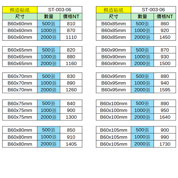 B60x60mm 2000張 1110元   B60x85mm 2000張 1450元