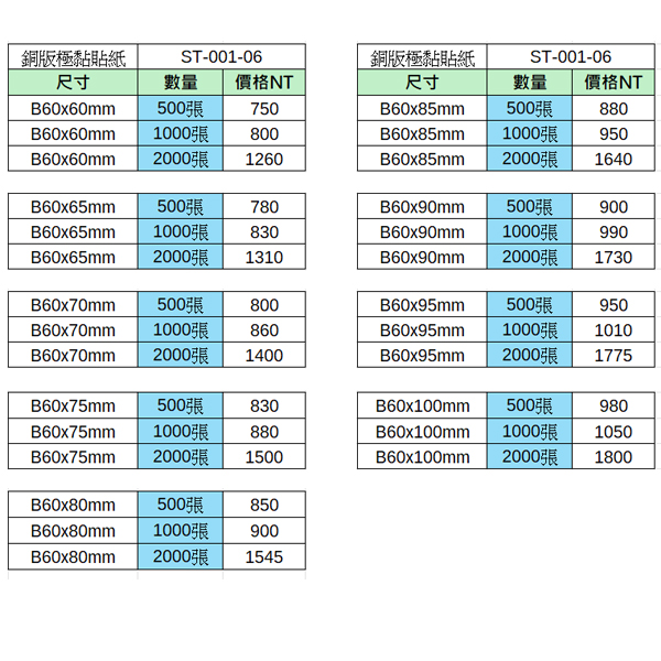 B60x75mm 2000張 1500元   B60x100mm 2000張 1800元