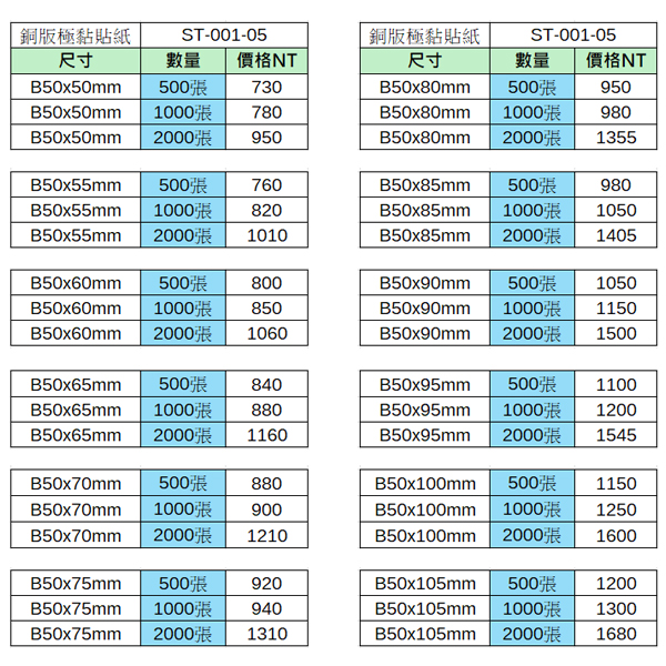 銅版極黏貼紙50x50~50x105mm(2000張)