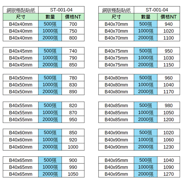 B40x40mm 2000張 800元   B40x70mm 2000張 1100元
