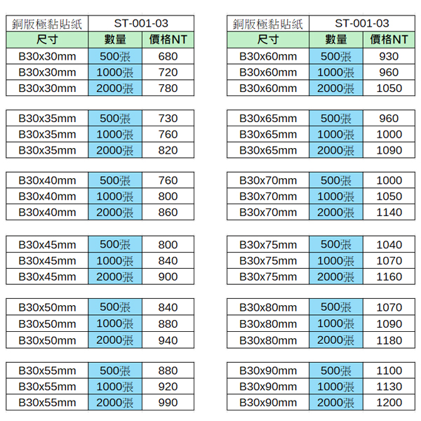 B30x30mm 1000張 720元   B30x60mm 1000張 960元
