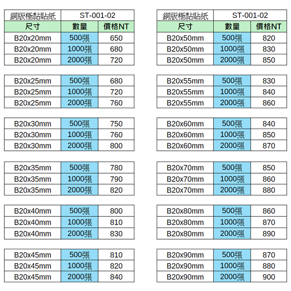 | B20x40mm | 2000張 | 830元 | B20x80mm | 2000張 | 890元 | |