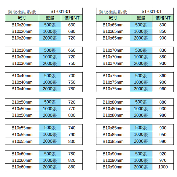 B10x50mm 2000張 800元   B10x80mm 2000張 980元
