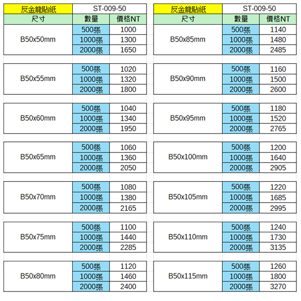 反金龍貼紙50x50~50x115mm(2000張)