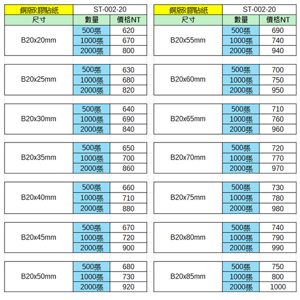 銅版R膠貼紙20x20~20x85mm(2000張)