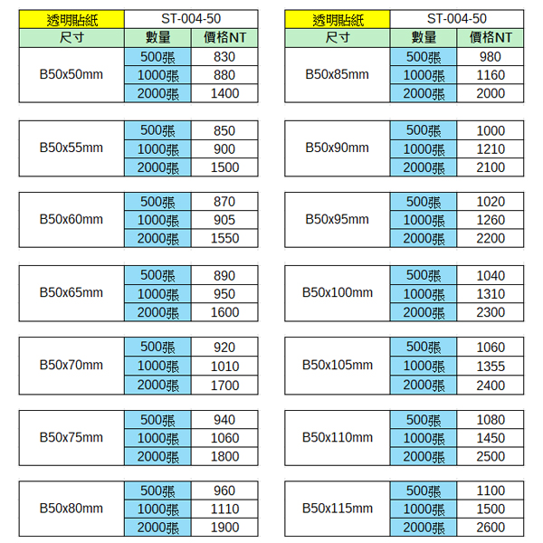 透明貼紙50x50~50x115mm(2000張)