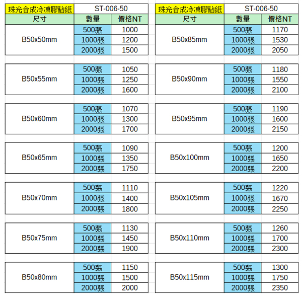 珠光合成冷凍膠貼紙50x50~50x115mm(1000張)