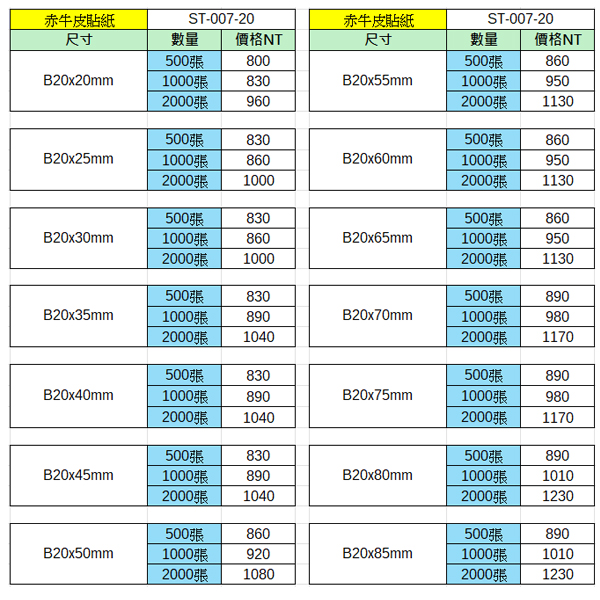 赤牛皮貼紙20x20~20x85mm(2000張)